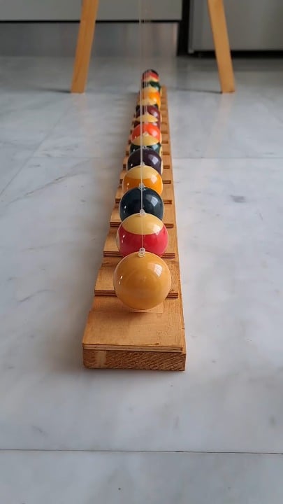 All the pendulums are released at the same time, but because they have different lengths, they swing at slightly different speeds. That difference makes them drift in and out of sync, creating the wave-like motion.